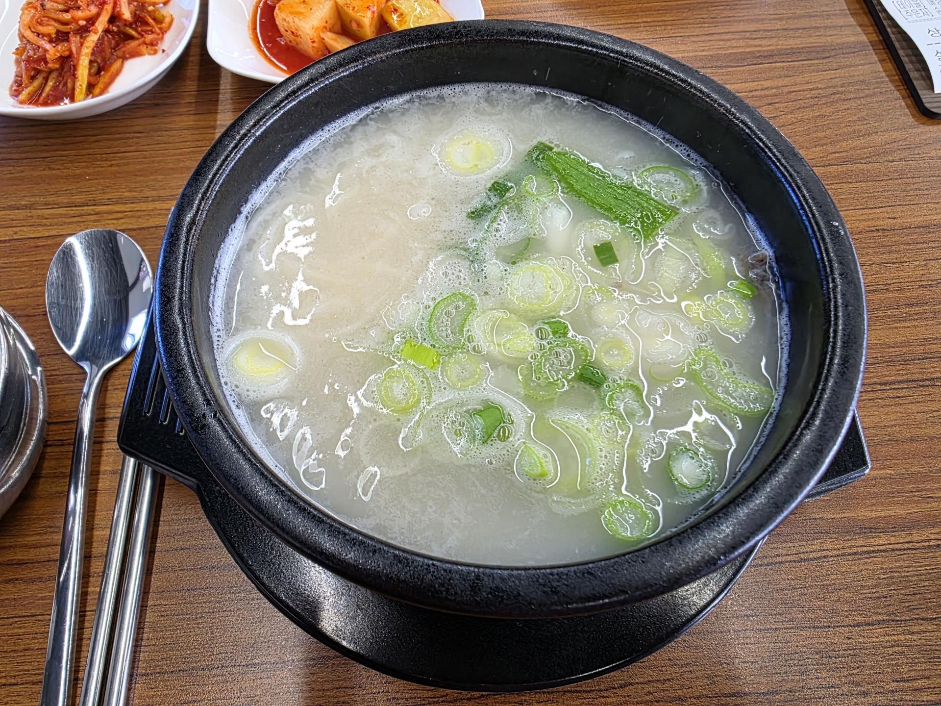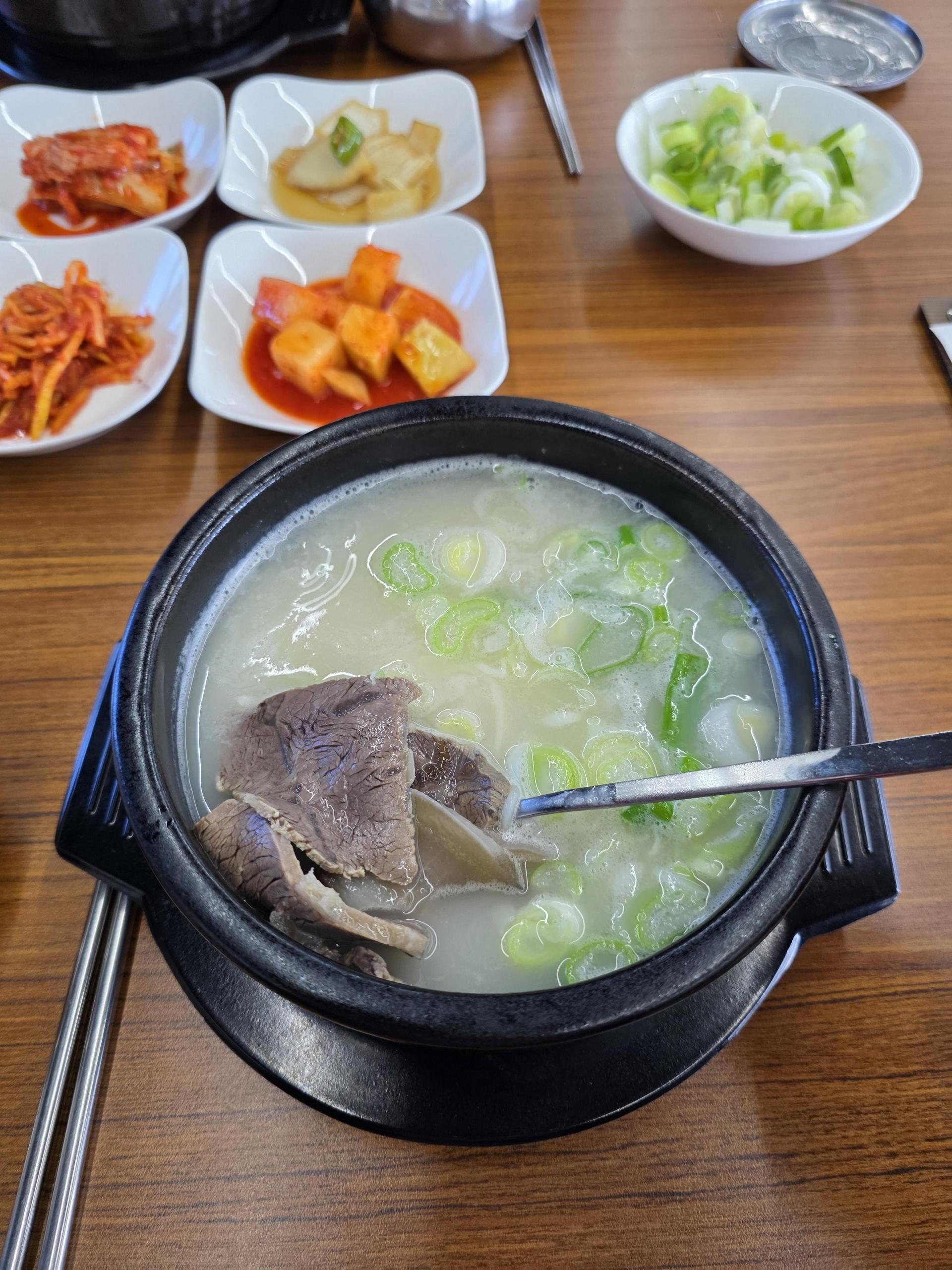 뽀오얀 국물이 진국임을 알려주는데 부드러운 소면과 고기 먼저 먹고 국물에 밥을 말아서 먹었어요